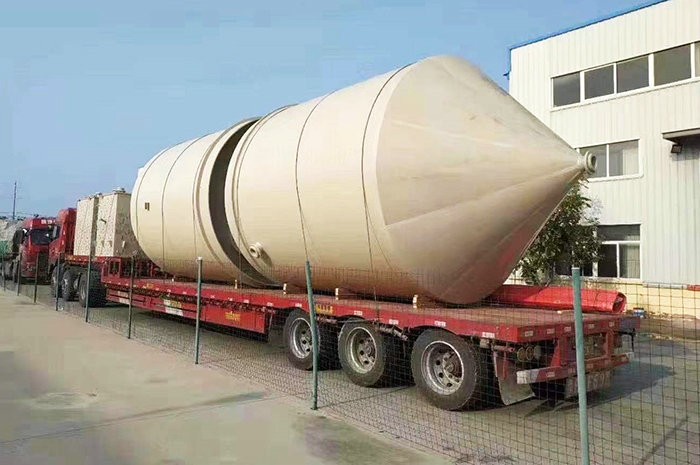 錐底儲罐采用意大利技術制作,內襯層為噴射成型制作,內襯層的富樹脂層樹脂含量達95%,內襯層樹脂含量為80%。儲罐內襯層采用錐形水泥模具制作,儲罐結構層為整體纏繞制作而成。罐體底部為帶鋼套環支腿,大大提升儲罐穩定性。攪拌型錐底立式儲罐,內設擋流板,罐體頂部設置支撐架,儲罐輕質、高強,耐腐蝕性強、使用壽命長。